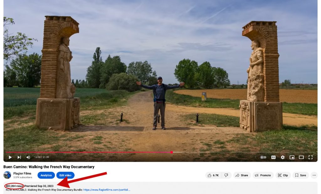 The Flagler Films documentary titled Buen Camino: Walking the French Way reaches 400,000 views on YouTube. The 32-minute documentary now has over 400,000 views, over 6,870 likes and hundreds of positive comments on YouTube. It’s now one of the most-watched Camino documentaries on the platform — and I’m grateful for all the support, encouragement and shared Camino stories from viewers around the world.